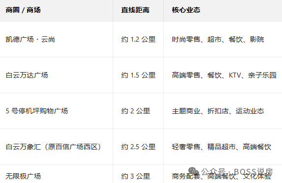 成熟商业配套:4 公里内覆盖凯德广场、白云万达、5 号停机坪等成熟商圈,1 公里内社区底商、超市、菜市场齐全,无需等待规划兑现。