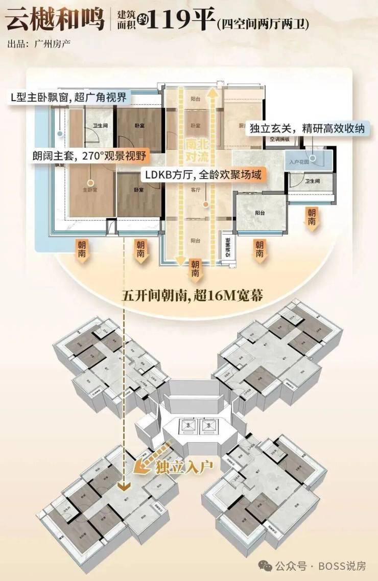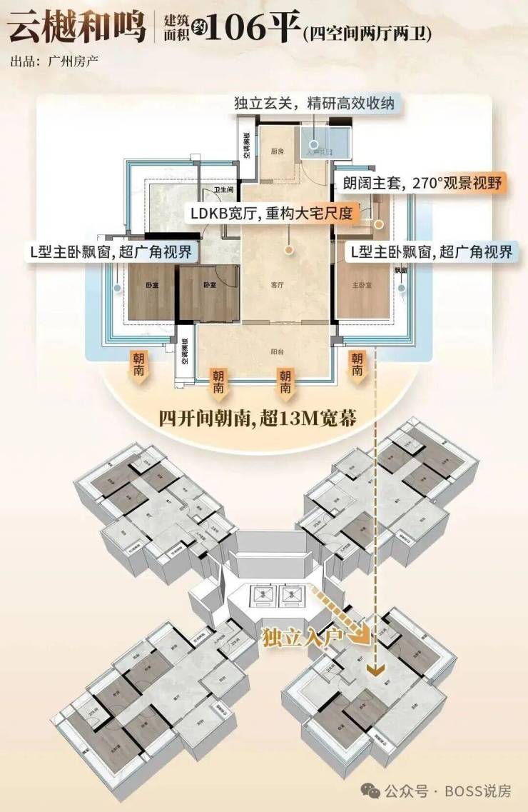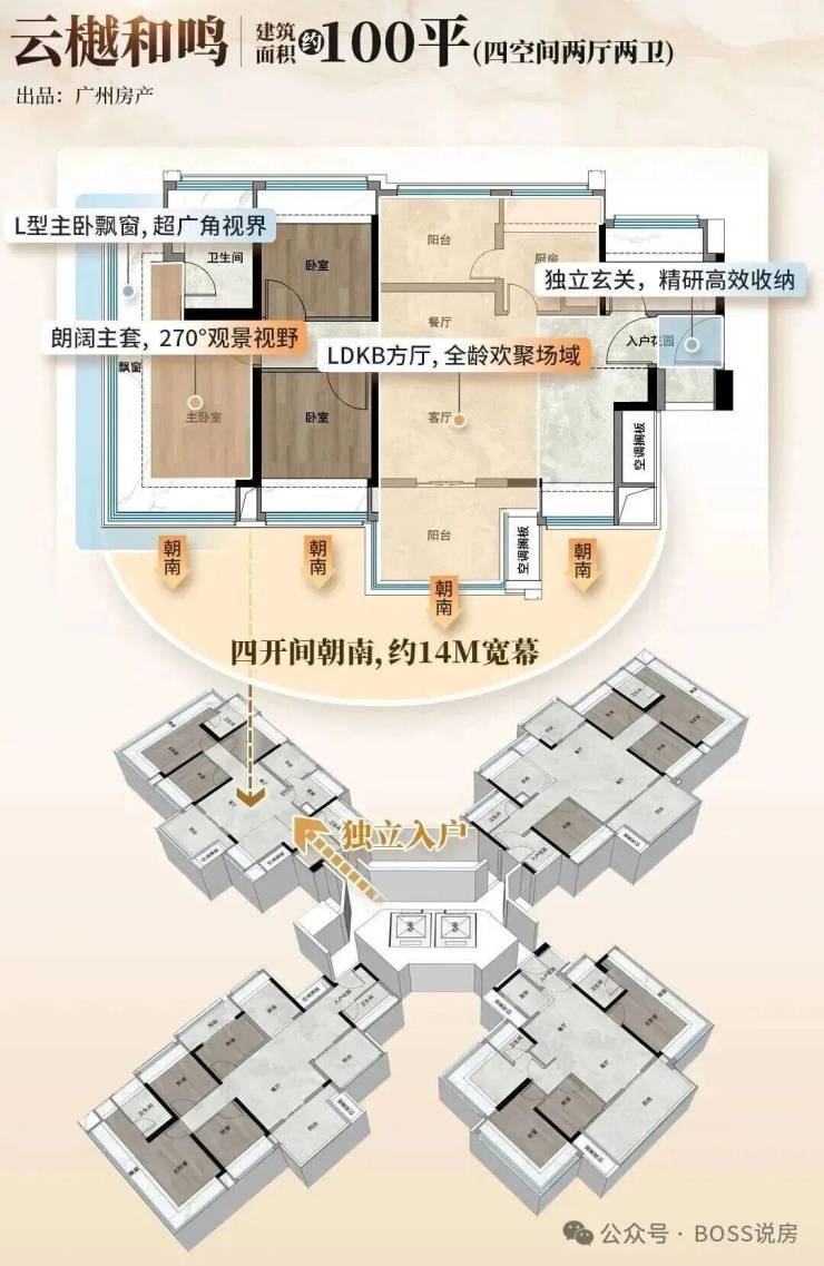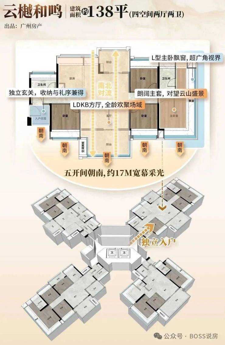 低密产品力:白云新城首个新规盘,3.0 容积率,3 栋塔楼一字排开,2 梯 4 户,无明显遮挡,高层可远眺白云山;约 100-138㎡全南向四房,四开间朝南,LDKB 一体化,高实用率。