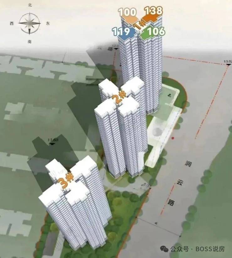 布局特点:3 栋塔楼一字排开,东南向无遮挡,高层可远眺白云山,每户采光与视野均衡,无明显遮挡。