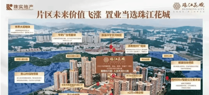 珠江花城项目位于广州市天河区智谷东片区,属于吉山板块,是天河区的一个刚需楼盘。由广州珠江实业开发股份有限公司负责开发,项目占地面积约30万平方米,总建筑面积约为85万平方米。规划栋数为45栋,分六期进行开发,总共提供5300户住宅单位,容积率为≤3.2,绿化率达到35%,车位比为1:1.1,总计有5800个停车位。物业管理由珠江城市服务公司承担,收费标准为2.8元/㎡。