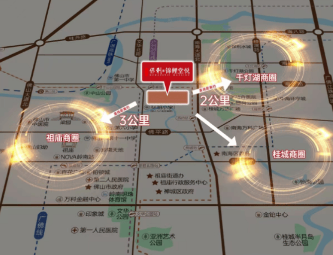 从规划发展来看,保利锦鲤堂悦的区位优势也很明显。项目位于禅城区文化北路与鲤鱼沙道交叉口,地处禅桂交界城北板块,毗邻祖庙、千灯湖两大核心商圈。祖庙是佛山的文化中心,千灯湖是佛山的金融中心,两大板块的红利辐射,让这个区域的发展潜力无限。