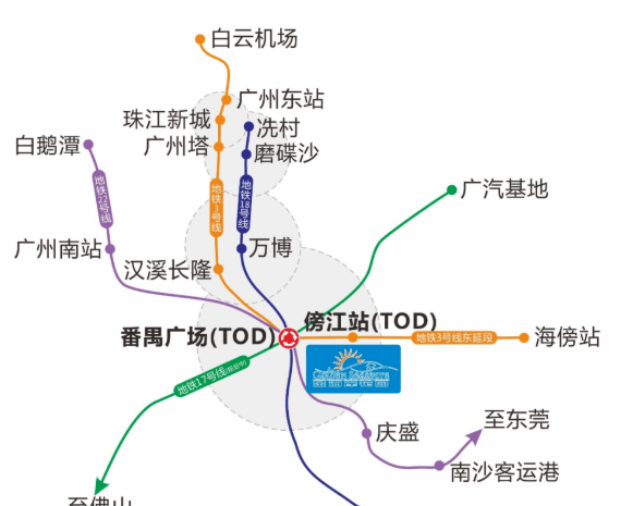 金海岸花园紧邻3号线东延段傍江站TOD,通过地铁网络可快速到达多个重要商圈及交通枢纽,包括: