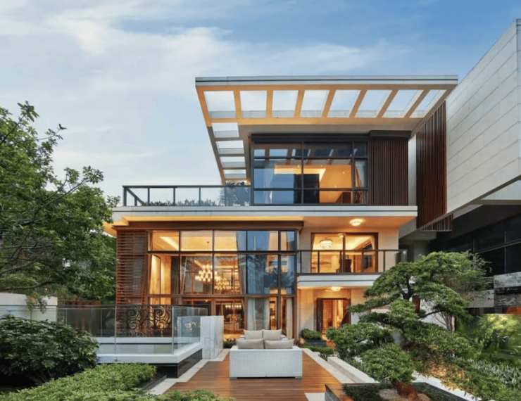 270°落地玻璃幕墙设计:实现360°全景视野,将自然美景引入室内,提升居住品质。