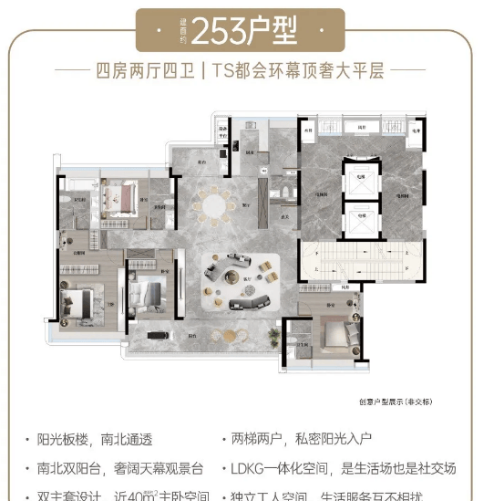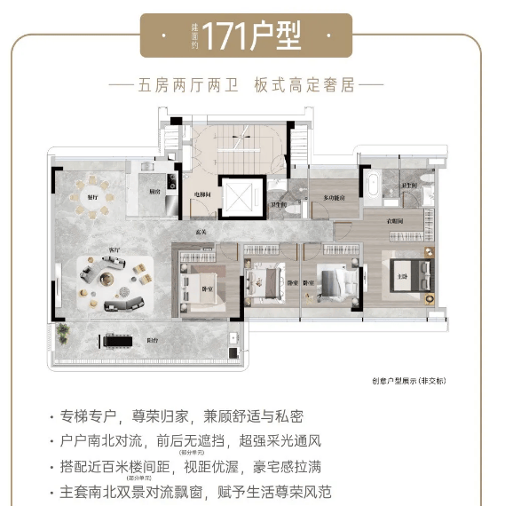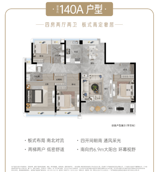 目前在售约 140 - 253 平南向板式住宅,涵盖四至五房。如 140a㎡高定四房景观视野佳,板式布局南北对流;140b㎡高定四房北瞰园林南望校园;171㎡奢适五房享长隆头排景观,专梯入户;205㎡奢适四房为中轴园林上的环幕景观楼王,双主卧套房设计;253㎡定奢五房同样为楼王,拥有约 10.3 米宽巨幕阳台等奢华配置。七大高品质超感精工对标宝格丽酒店,携手杜拉维特、汉斯格雅等德系一线国际品牌,铸就高定奢宅品质。