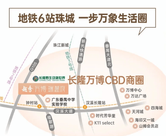越秀・万博・瑞麓府前身是长隆麓府,后与越秀合作入市。项目紧挨长隆动物世界西南侧,西侧靠近钟顺路,距离万博 CBD 约 5 公里,开车 10 分钟左右可达。公共交通方面,离 7 号线钟村站约 1.2 公里,步行需 15 分钟,目前沿途道路在改造,步行体验不佳。不过,坐地铁 2 站到万博,3 站到广州南站,6 站到珠江新城。自驾较为便利,家门口钟顺路连接汉溪大道、南大干线,约 10 分钟可到长隆万博 CBD,约 30 分钟可达珠江新城,去往琶洲、大学城等地时间也能控制在 40 分钟以内,但依赖地铁出行需解决接驳问题。