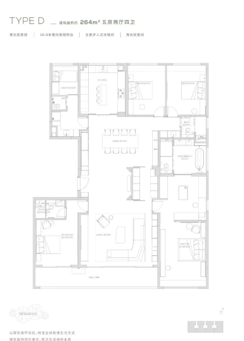230-265㎡五房两厅四卫:高端改善户型,客厅面宽超 8 米,主卧配备独立书房与观景浴缸,全屋落地窗,部分楼栋可享山景 + 湖景双重景观,适合高净值家庭;