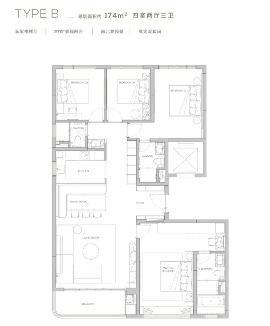 174-193㎡四房两厅三卫:进阶改善户型,四开间朝南,LDK 一体化设计,部分户型带 270° 环幕阳台(俯瞰湖景),双主套设计,满足二胎家庭或三代同堂;