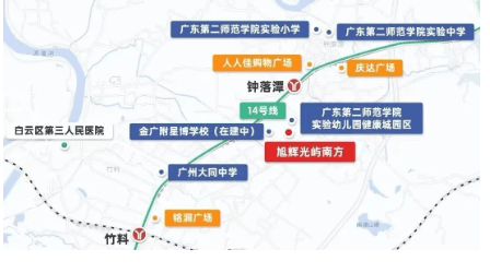 旭辉光屿南方交通优势显著。项目位于地铁 14 号线钟落潭站旁,距离约 1000 米,乘坐地铁 5 站可到嘉禾望岗,换乘 2、3 号线能直通白云新城,畅达广州全城。自驾出行同样便利,华南快速、京港澳高速等多条交通要道环绕,可纵横大湾区。此外,18 号线北延段(在建中)将在白云东平站与 14 号线交汇,届时换乘 7 站即可到冼村;广佛环线(预计 2025 年通车)3 站可达天河智慧城,5 站到琶洲;新白广城轨(在建中)1 站直达白云机场,南向可通达东莞和深圳,多维交通网络让您轻松畅行。