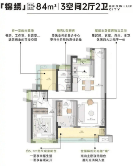 84-87㎡三房两卫:优化动线,5.7米以上宽景阳台,主卧套房设计,适合三口之家一步到位。