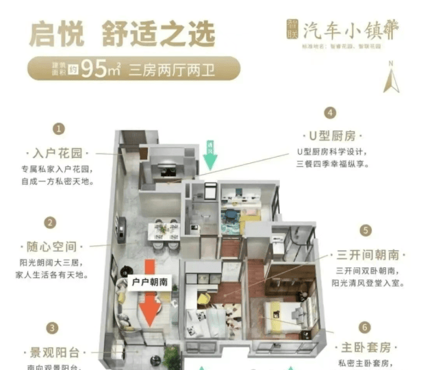 95㎡三房两卫:经典竖厅布局,动静分区,私家入户花园、U型厨房、双南向卧室、明卫设计,主卧带独立卫浴,总价166万元起;