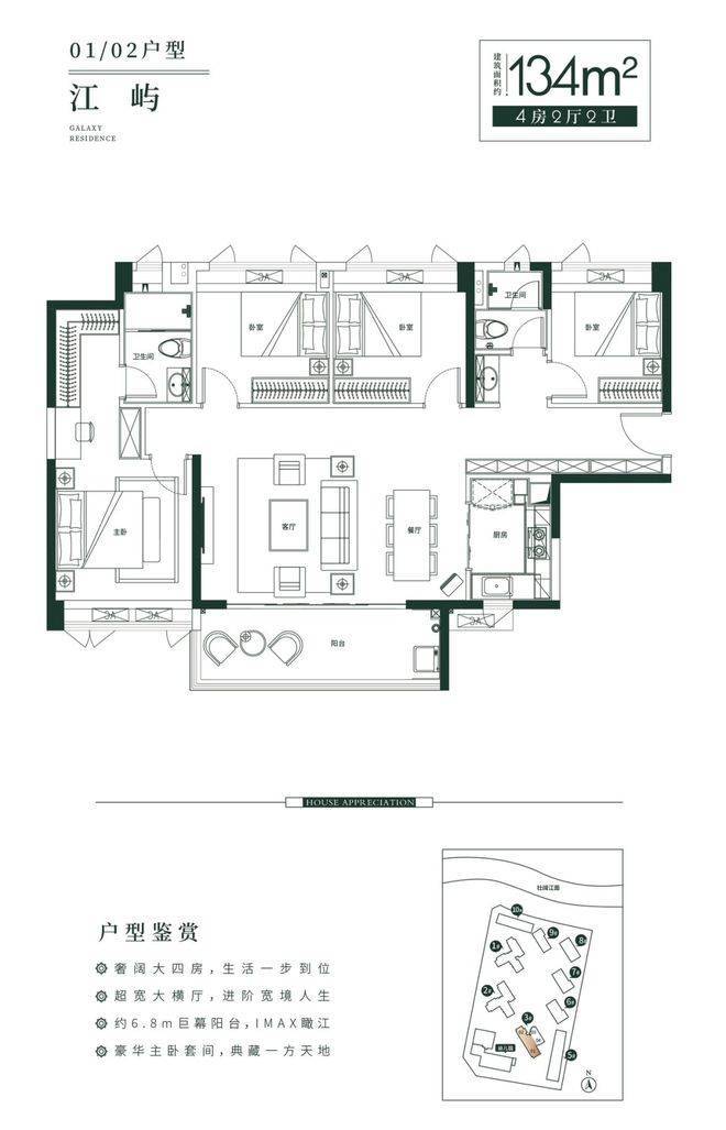 建面约134㎡四房两厅两卫户型则进一步拓展空间格局。横厅设计增强公共空间开阔感,客餐厅一体化布局提升家庭互动氛围。约6.8米宽阔阳台带来IMAX级观景体验,将270°江景尽收眼底。主卧套间面积充裕,兼顾休憩与收纳需求,营造更为从容的生活场景。多功能房间可灵活改造为书房、儿童房或长辈房,满足多代同堂或改善型家庭的多样需求。整体户型强调大面宽、强采光与景观优先原则,让每一寸空间都与江景相连。