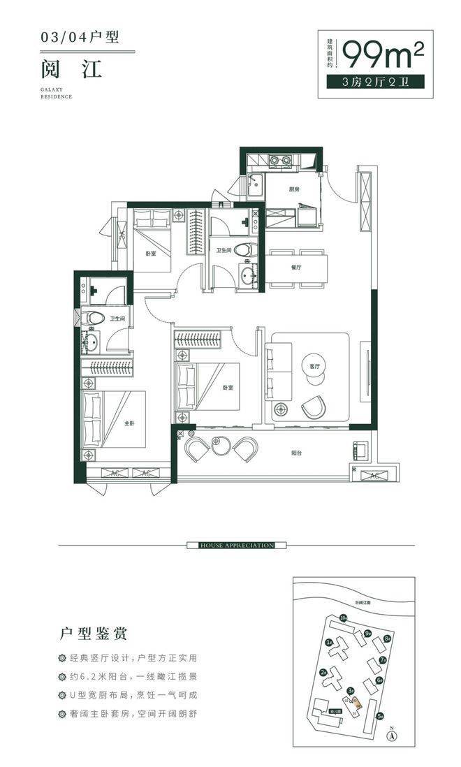 在户型设计上,星河·江堤春晓注重空间效率与景观价值的结合。建面约99㎡三房两厅两卫户型采用经典竖厅结构,整体布局方正,动静分区明确。约6.2米宽景阳台连接客厅与景观面,将江景引入室内,增强空间延展感。U型厨房操作流线合理,满足家庭烹饪需求;主卧套房设计强化私密与舒适体验,实现功能与尺度的均衡。对于三口或四口之家而言,该户型在实用面积与居住品质之间取得良好平衡。