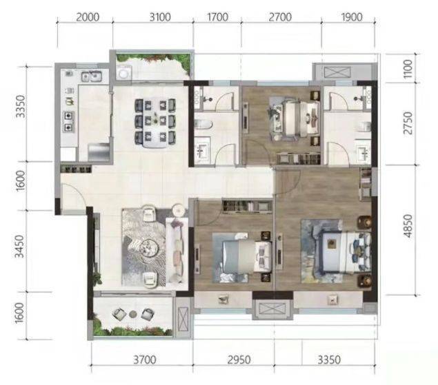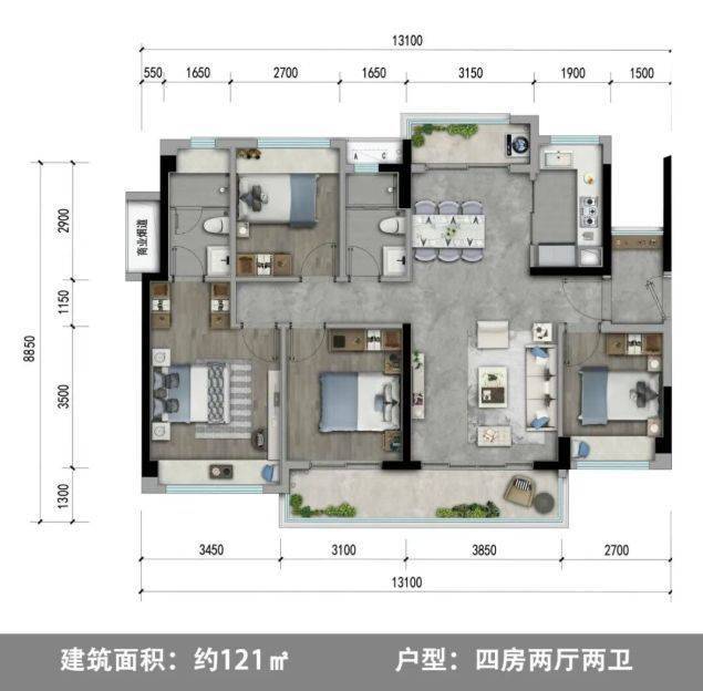 121㎡四房:四房的布局适合人口较多的家庭或对居住空间有较高要求的改善型购房者。客厅宽敞大气,与餐厅、阳台相连,形成通透的空间格局,让阳光与清风自由穿梭。主卧套房不仅空间宽敞,还带有独立的卫生间和衣帽间,营造出舒适私密的居住环境。其余三间次卧可分别作为儿童房、客房和书房,满足多样化生活场景。餐厅可容纳较大尺寸餐桌,满足家庭聚餐需求,让家人享受温馨的用餐时光。