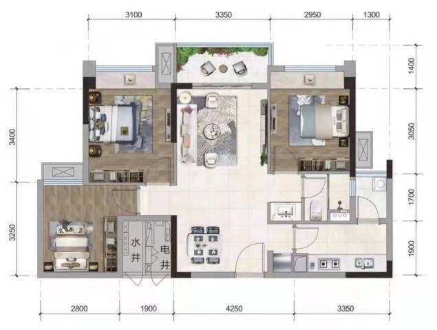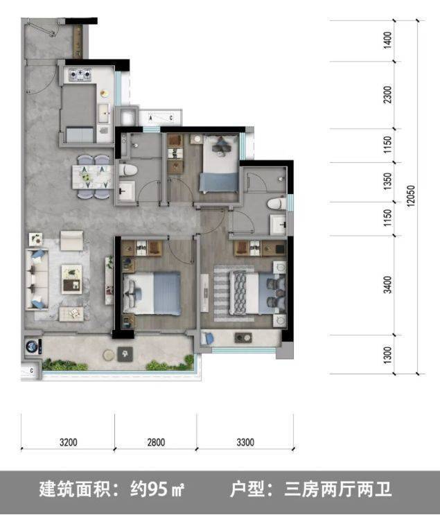 95㎡三房:空间尺度更为舒适,三房设计满足家庭成长需求。客厅与餐厅一体化,营造出宽敞明亮的公共活动区域,方便家庭聚会与日常休闲。主卧套房设计,配备独立卫生间,提升居住私密性与便利性。次卧和儿童房也布局合理,可根据家庭实际需求灵活布置。阳台面积较大,可打造为空中花园,享受阳光与绿植相伴的惬意生活。此户型适合追求品质生活且注重空间实用性的家庭。