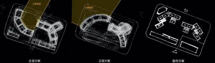 为充分考虑南向城市界面与北向珠江沿岸界面,经过建筑师多轮方案讨论及推敲,提出了环抱式规划方案。