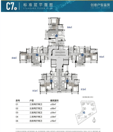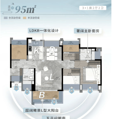 约85平方米的三房户型同样表现出色,南向超大观景阳台让室内光线充足,阔绰餐厨空间盛载三餐四季。大飘窗套房式主卧设计,经典竖厅布局,动静分离,为家庭成员提供了独立且私密的休息空间。而约95平方米的四房两厅两卫户型,则实现了五开间朝南,超阔瞰景阳台让四时美景尽收眼底,南北对流设计保证了空气的流通,奢阔私密主卧套房更是提升了生活的仪式感。