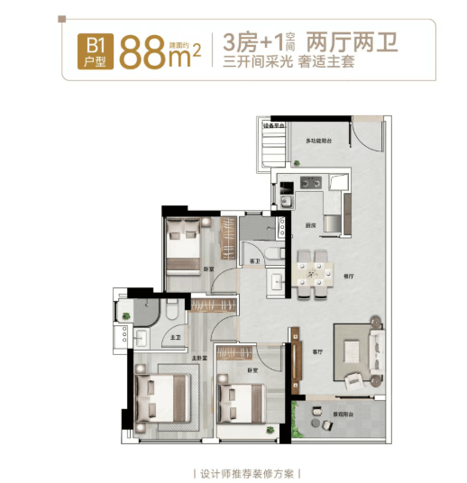 约88㎡3房+1(空间)2厅2卫户型,分为竖厅与横厅两种布局,均为热销爆款户型,是刚需改善的首选。其中,竖厅户型分为南向、北向两种选择,满足不同业主的采光需求。经典竖厅设计,将卧室与客餐厅实现动静分区,休息区与活动区互不干扰,保证了业主的居住私密性;三开间采光,望中央园林景观,超百米楼间距,让室内明亮通透,推窗即可欣赏到园林美景;+1空间灵动多变,可根据需求改造为书房、储物间或儿童房,提升房屋的实用率;双卫设计,满足家人的日常使用需求,避免了早晚高峰期的排队等待,提升了居住的便捷性与舒适度。