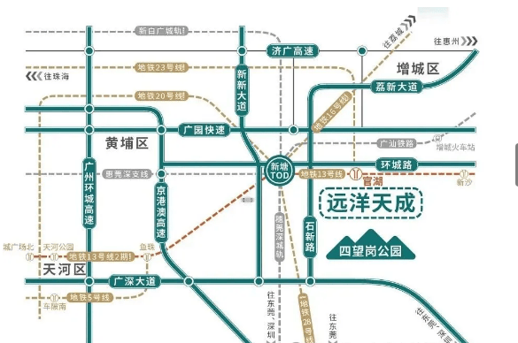 项目交通优势体现在 “近地铁 + 邻 TOD” 的双重布局。距离地铁 13 号线官湖站仅 1.1 公里,步行 12-15 分钟即可到达,搭乘 13 号线可快速衔接黄埔、天河等核心区域,实测早高峰通勤便捷性突出。更值得关注的是,项目邻近新塘 TOD,这里规划打造 10 轨交汇的国际枢纽,涵盖 5 条地铁、3 条铁路及 2 条城际轨道,未来可实现 3 分钟零换乘,25 分钟直达广州东,30 分钟通达白云机场,53 分钟直达深圳宝安机场,甚至可通过延长线连通香港,轻松融入 1 小时大湾区生活圈。