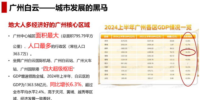 尤其值得关注的是,白云区在“十四五”期间计划总投资高达1.67万亿元,远超天河、黄埔等传统强区,稳居全市首位。2024年上半年,白云区GDP增速达6.3%,领跑全市,甚至超越天河、越秀等老牌中心城区。这一数据背后,是政府真金白银的投入、龙头企业的大规模进驻以及城市功能的全面升级。