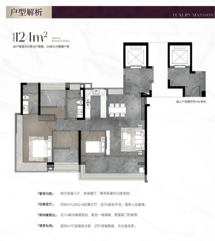 核心亮点:项目 “顶配户型”,3T4 户纯板楼设计,独立入户玄关保障隐私;南向面宽超 15 米,客厅连接约 8 米宽景阳台,部分高楼层可远眺白鹅潭江景;主卧套间带 “独立卫浴(双台盆 + 浴缸)+ 步入式衣帽间 + 观景飘窗”,使用面积超 30㎡,媲美五星酒店套房;双次卧为套房设计(带独立卫浴),适合父母同住,实现 “三代同堂互不干扰”;装修标准约 8000 元 /㎡,选用德国唯宝卫浴、西门子厨电、摩恩五金等国际一线品牌,配备 VRV 中央空调与金质岩板收纳体系,细节处彰显高端品质,适合 “高净值终极改善家庭”。