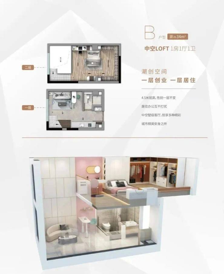 项目主推3 栋 LOFT 公寓,在售建面约 **33㎡、50㎡、58㎡** 三大主力户型,得房率约 82%,空间利用率远超同类产品: