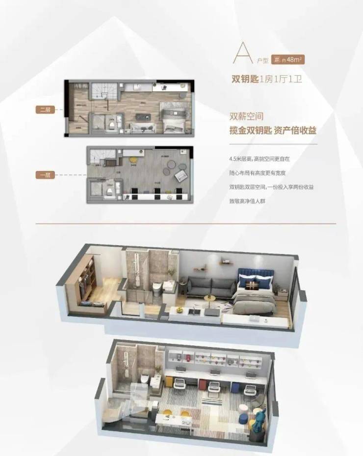 总价约 119-125 万,首付 3 成仅 36 万起。4.5 米层高,双钥匙设计,买一套租两套,投资回报率超高;全明格局、落地窗设计,采光通风极佳,适合单身贵族、投资客。
