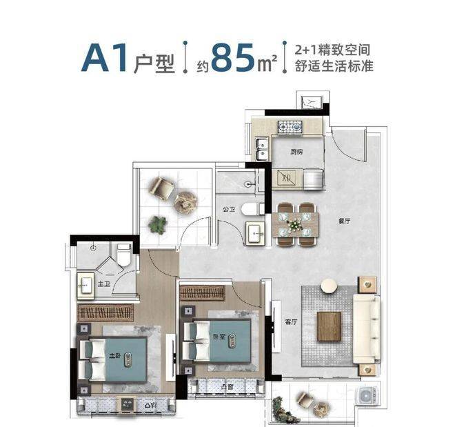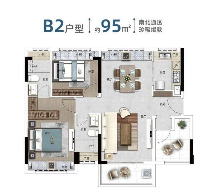 产品设计走高品质路线。85-108㎡三至四房全部南向,南北通透,采光通风优秀。客厅开阔,阳台视野无遮挡,主卧尺度合适,整体格局方正实用。户型注重功能性和舒适度,空间利用率高,飘窗、阳台放大室内尺度,实际居住感超出面积预期。适合小家庭首次改善,也能满足三代同堂的需求。