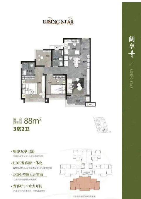 88㎡三房:LDK一体化方厅,采光通风俱佳,家庭互动空间大;