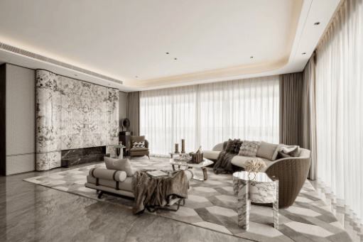 370㎡户型的空间布局极具匠心,采用洄游动线设计,串联厨房、餐厅、客厅、阳台等功能空间,让空间相互打开,既保证了空间的通透性,又提升了空间的利用率。约13m宽的横厅设计,搭配面宽约10m的南向阳台,不仅营造出开阔的视野,更成为家庭公共聚场,无论是家人欢聚,还是好友小聚,都能从容应对。南向阳台直面横沥岛尖C位江景,凭栏远眺,三江汇聚的壮阔美景尽收眼底,东望入海口,西看无尽延绵江河,视野开阔无遮挡,将自然之美与城市繁华完美融合,让每一次驻足都成为一场视觉盛宴。