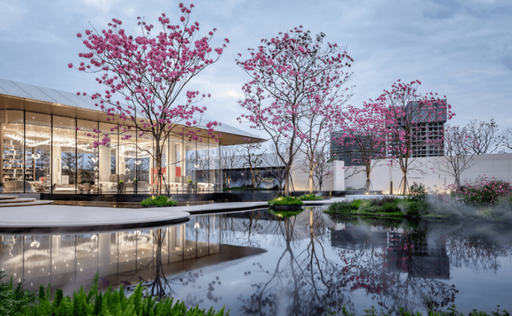 如同售楼部外定制高端水景,让地面植被与天光云影投景入水,打造IMAX级宽幕水景,景观视野体现得淋漓尽致。