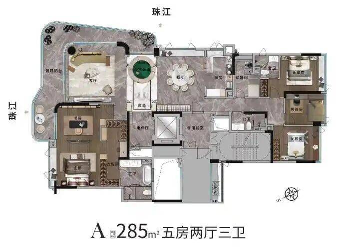 如果说193㎡户型是改善家庭的优选,那么285㎡五房户型则是为追求极致生活品质的顶层人士打造的终极居所。该户型的最大亮点在于其270°环幕江景阳台,这一设计在广州楼市中极为罕见。站在阳台上,仿佛置身于游轮甲板之上,前后左右皆是江水,400米宽的江面一览无余。无论是日出东方的壮丽,还是日落西山的柔美,亦或是夜幕降临后的璀璨灯火,都能在这里得到最完美的呈现。这种全方位的观景体验,让人心胸开阔,豪情万丈,真正实现了“江山尽在掌握”的人生境界。