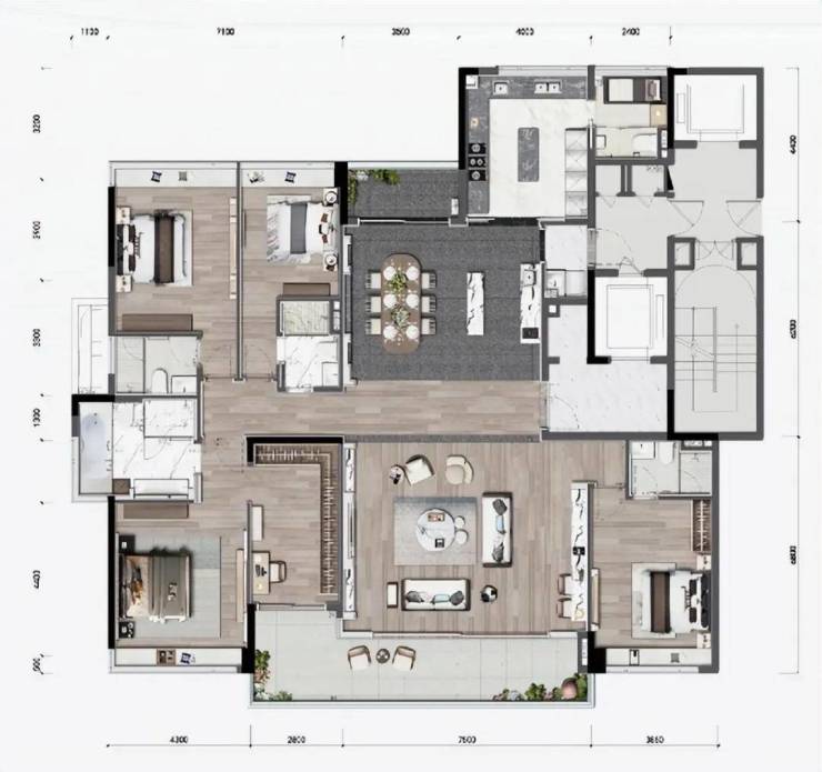 290㎡户型:五房双套房设计,满足三代同堂居住需求;约10米南向面宽,客餐厅面积达70㎡,可举办家庭聚会或私人宴请;主卧套间面积超50㎡,配备独立书房、步入式衣帽间及五星级卫浴。