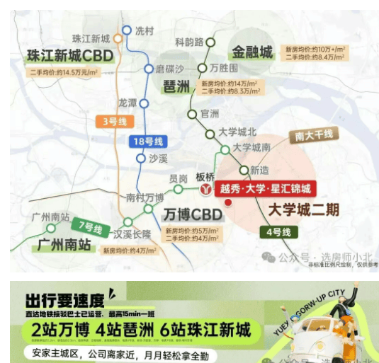 尽管越秀大学星汇锦城距离地铁站较远,但项目通过多种方式弥补了这一短板。距离最近的板桥地铁站约3公里,步行需40分钟,不过小区已开通直达地铁站的接驳巴士,高峰时段每15分钟一班,极大地方便了居民的日常通勤。此外,项目周边有多条主干道,如南大干线和兴业大道,自驾出行非常便捷。对于需要前往琶洲、金融城等地的居民来说,这里的位置尤为优越,无需等待红绿灯即可直接上新化快速路,大大缩短了通勤时间。