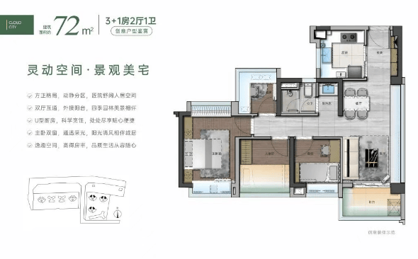 使用率超高,73㎡即可做四房,充分满足不同家庭结构的需求。