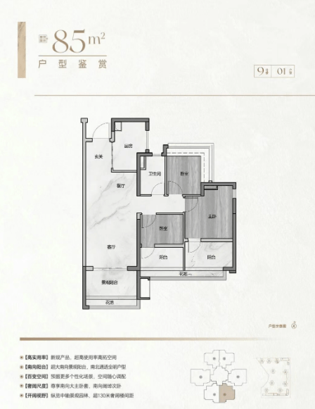 85平方米三房两卫:纯南向望花园,楼间距达130米,采光极佳。