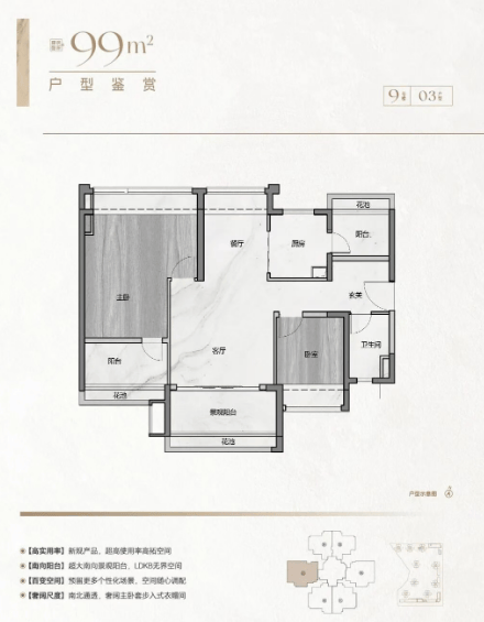 99平方米四房两卫:南北对流竖厅,动静分区明确,一步到位解决换房问题。