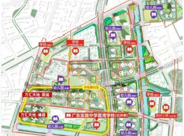 教育配套:与省实花地湾校区直线距离约 300 米(具体入读政策以当年教育局公布为准)。整个万汇天地规划有 7 所幼儿园、3 所小学、3 所中学。项目自带一所 54 班规模的九年制省实验学校花地湾校区,涵盖小学部和初中部,但升入中学阶段仍需参加全区统一摇号分配。售楼处电话:4009909752 。