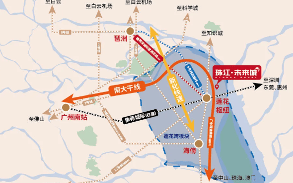 交通是区域价值兑现的核心引擎。珠江·未来城坐享前所未有的轨道交通红利。项目紧邻规划中的广州地铁8号线东延线莲花山站,并有望接入17号线(规划中)。此外,佛莞城际(在建)、穗莞深城际琶洲支线(在建)以及广中珠澳高铁(规划)三大城轨线路环绕周边,构建起覆盖广佛莞深乃至整个大湾区的高效通勤网络。