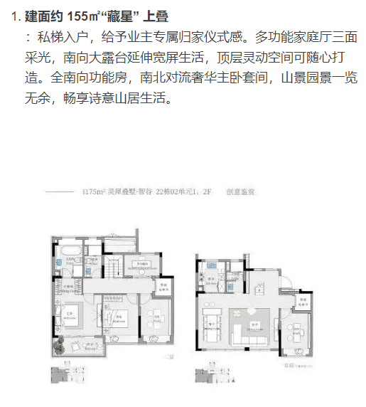 建面约155㎡“藏星”上叠:私梯入户,多功能家庭厅三面采光,顶层灵动空间可随心打造,享受诗意山居生活。