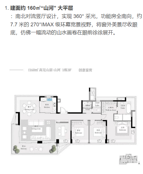 建面约160㎡“山河”大平层:实现360°采光,约7.7米的270°IMAX级环幕宽景视野,将窗外美景尽收眼底。