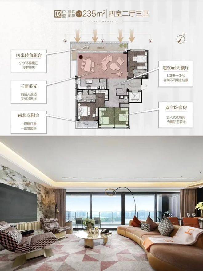 项目的产品力也十分突出,纯板式设计、专梯专户、双主卧套间、LDKB一体化、高得房率等配置,每一项都贴合高端改善家庭的居住需求,179-235㎡的大平层户型,精准适配不同规模的大家庭,无论是三口之家、二胎家庭,还是与老人同住,都能找到合适的户型,享受宽敞舒适的居住空间。
