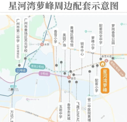 交通便利性方面,星河湾萝峰紧邻广州地铁6号线香雪站,通过便捷的轨道交通网络,可以快速到达天河等市中心区域。同时,项目周边还有多条公交线路和规划中的地铁线及有轨电车线,构建了多维度的交通体系,为居民提供了极大的出行便利。