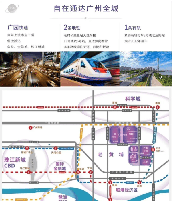 项目地处黄埔大道与广园快速路之间的城市发展主轴,占据黄埔临港经济区与科学城板块的核心交汇点,区位价值不言而喻。自驾出行极为便捷:10分钟直达鱼珠CBD,20分钟抵达广州国际金融城,30分钟无缝衔接珠江新城,轻松融入广州主城区“半小时生活圈”。