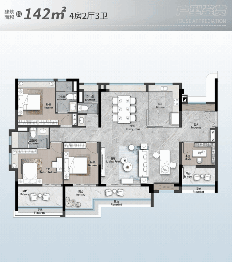 在户型设计上,天河源筑摒弃了传统住宅的刻板印象,采用了更加灵活、实用的设计理念。其中,建面约142㎡的户型是本次销售的明星产品之一。该户型做到了南北对流,采光通风效果极佳,能够有效调节室内温度,营造舒适的居住环境。超大LDKB(客厅、餐厅、厨房、阳台)一体化设计,不仅增加了空间的通透感,还为家庭聚会、好友轰趴等活动提供了充足的空间。双套房设计更是兼顾了家庭成员之间的隐私与便利,三代同堂的大家庭也能各得其乐。