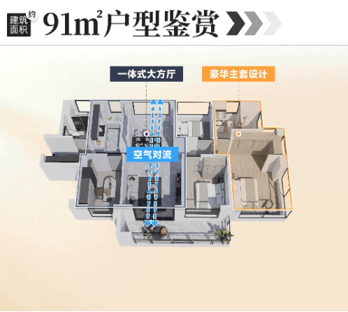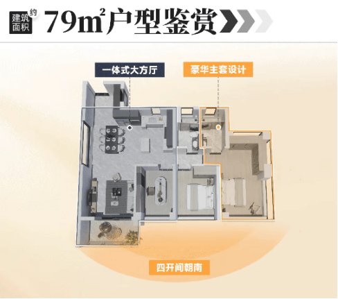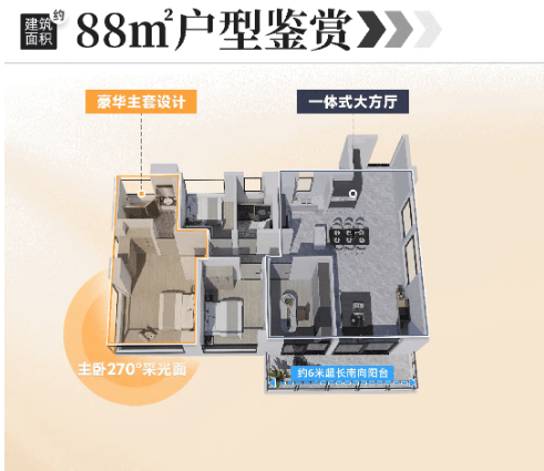 以89㎡的三房两厅两卫户型为例,该户型实现了四开间朝南,让阳光充分洒进每一个房间,营造出温暖舒适的居住环境。约6米宽景阳台,不仅视野开阔,可欣赏到小区园林美景,还能为业主提供一个休闲放松的户外空间。