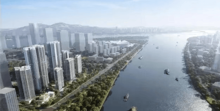 项目拥有约500米一线江岸线,93%户型可享南向江景,头排房源实现270°无遮挡视野,实测江面宽度约460米,景观资源稀缺性显著。