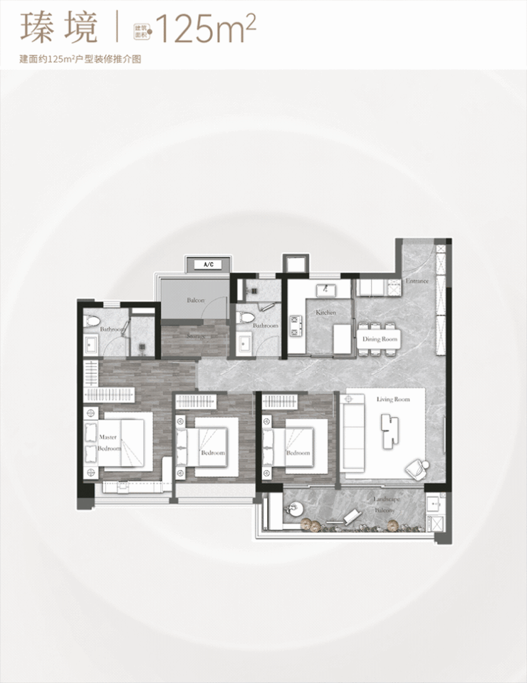 建面约125㎡四房户型:该户型为改善型户型,空间宽敞明亮,全南向布局,采光通风俱佳。户型设计方正,动静分区清晰,客厅与餐厅相连,拓展活动空间,适合家庭聚会;四个卧室布局合理,可满足多人口家庭居住需求,其中主卧配备独立卫浴,保障私密性与舒适性;独特设计亮点在于门口设有独立防火门楼道,业主关闭防火门后即可作为私家入户空间,可用于打造鞋柜、堆放杂物等,且该部分空间不计入房产证,提升空间利用率。