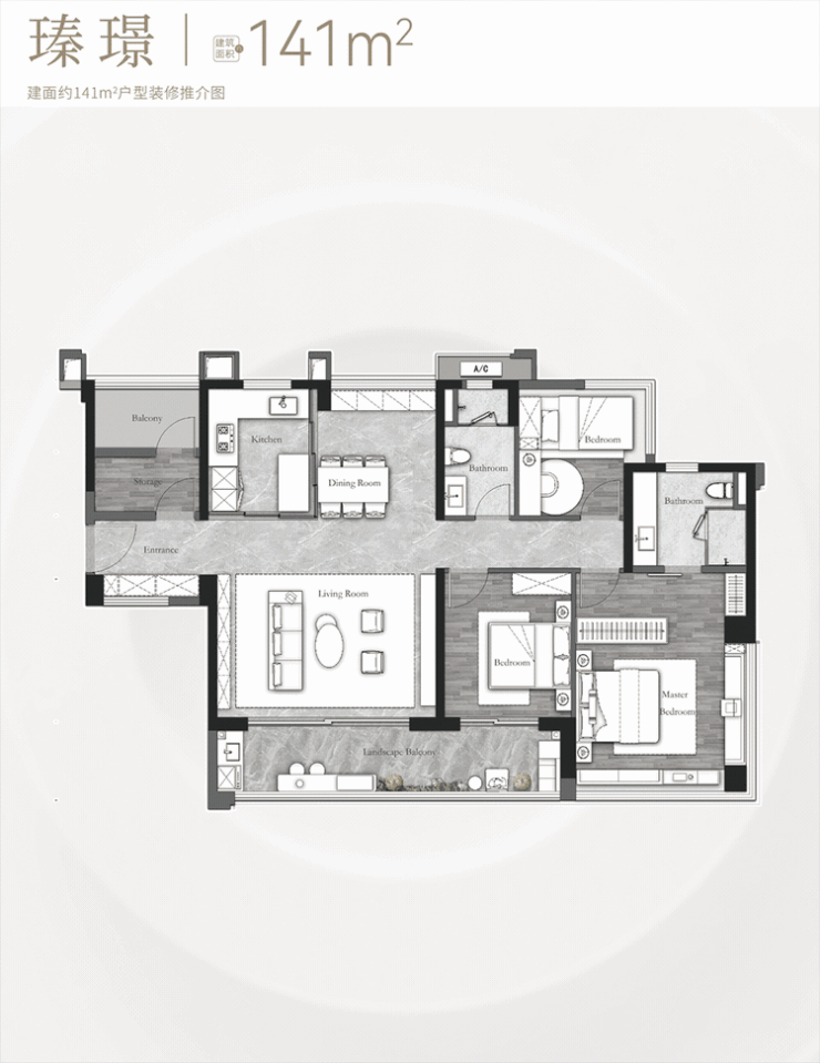 建面约141㎡四房户型:该户型定位高端改善,空间开阔大气,全南向设计,视野开阔,可充分享受滨水景观与社区园林美景。户型布局科学,动静分区明确,客厅宽敞明亮,连接超大景观阳台,采光通风效果极佳;主卧套房设计,配备独立卫浴与衣帽间,彰显高端品质与私密性;同样配备独立防火门楼道,私家入户空间可灵活利用,提升居住便捷度与实用性;厨房与餐厅相连,操作便捷,满足大家庭烹饪与用餐需求。