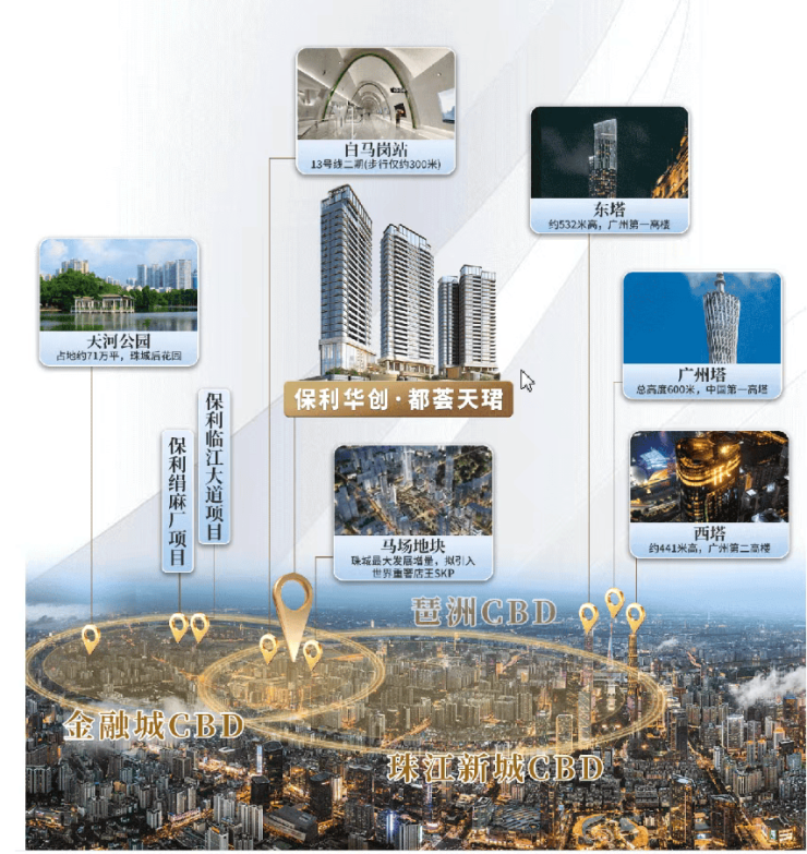 保利华创·都荟天珺落子于珠江新城东侧,紧邻马场地块,与珠江新城东区仅一路之隔,地处华南快速与黄埔大道交汇处,地理位置堪称黄金十字轴心。项目西侧直面珠江新城成熟CBD,东接广州国际金融城,南望琶洲数字经济试验区,三大城市核心引擎环伺,形成“10分钟黄金生活圈”。