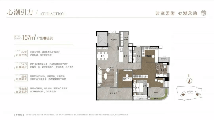 户型涵盖157㎡、196㎡、203㎡、253㎡、257㎡五大面积段,均为大平层设计,全部配备双阳台、270°弧形飘窗,最大化引入自然采光与景观视野。其中,2栋为楼王单位,层高达3.3米,专梯专户,253㎡四房南北通透,10米观景阳台贯通客厅与次卧,主卧与主卫均采用270°全景落地窗,尽揽城市天际线。